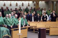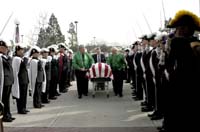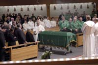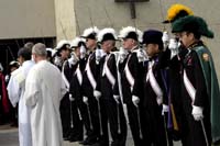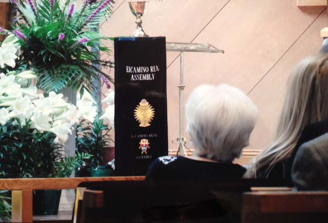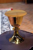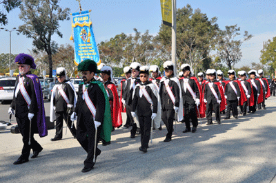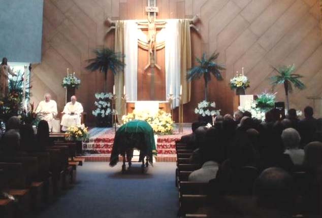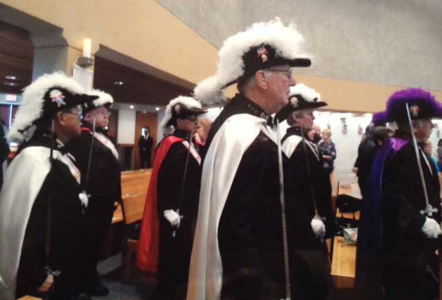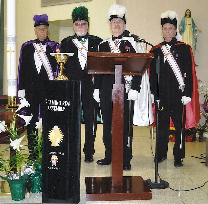 Former Fountain Valley Mayor and 4th-degree Knight Guy Carrozzo was laid to rest on April 7 at Riverside National Cemetery, following a funeral mass at Holy Spirit Church. His three grandsons and grandson-in-law served as pallbearers. His widow, Dolores, was shown the engraved chalice that will be sent to a priest in an impoverished parish for use at Mass. |