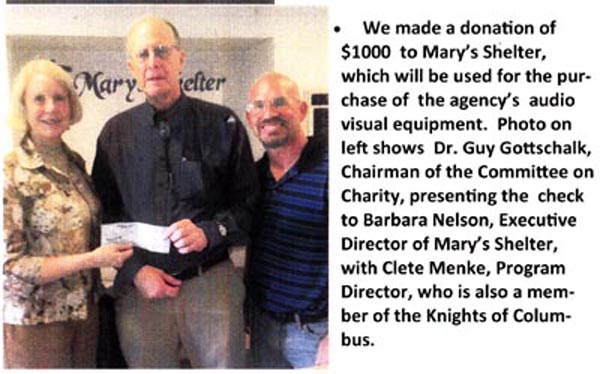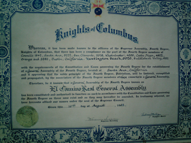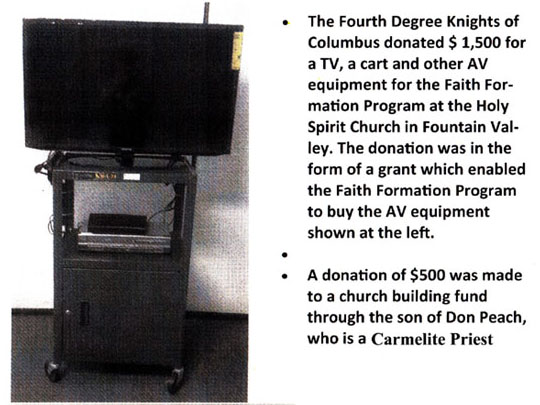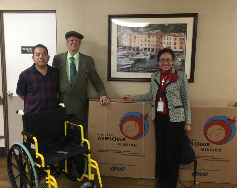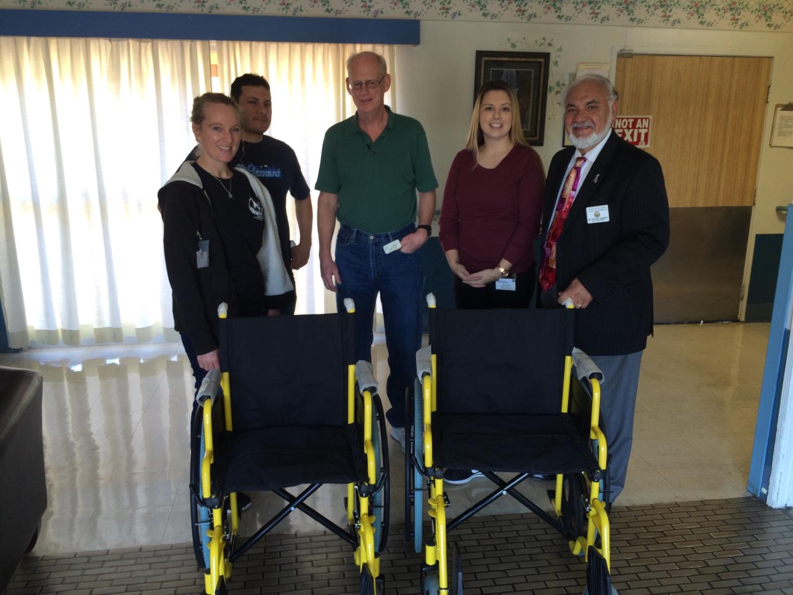 On behalf of Knights of Columbus; El Camino Real Assembly 85, two wheelchairs were donated to the children's convalescent home in Westminster, California. The wheelchairs were presented by SK Victor B. Sanchez and his son Dr. Michael A. Sanchez. |