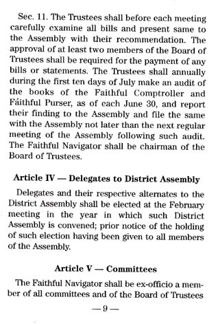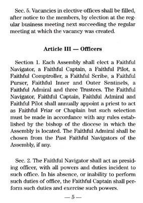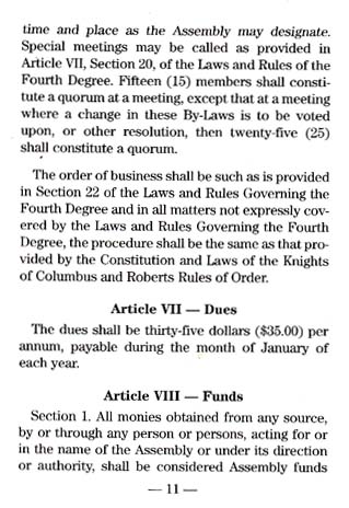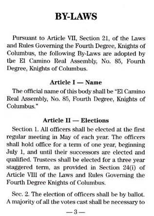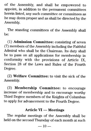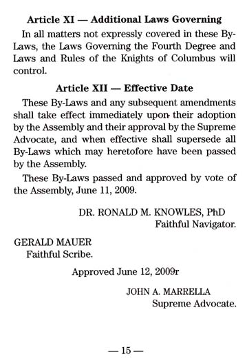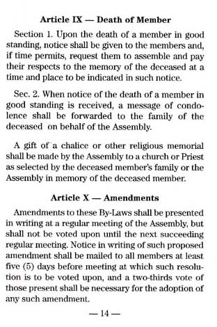 have mastered Honorary and Honorary Life Membership: (a) Members who have attained the actual age of 65 years and who have been members of the Fourth Degree for 25 consecutive years, shall be designated as Honorary members and on due request in writing they shall be exempt from general fund charges, except payment of $10.00 per annum which shall include all assembly dues charges and levies. (b) Members who have attained the actual age of 70 years and who have been members of the Fourth Degree for 25 consecutive years, and those who have been members the Fourth Degree 50 years regardless of age, shall be designated as Honorary Life members and on due request from the Faithful Comptroller, they shall be exempt from further payment of dues. (c) The status of Honorary Life Membership which a priest or member of a religious community automatically acquires upon taking the First Degree of the Order shall ensure to such member upon his qualifying for and taking the Fourth Degree and such member shall be exempt from the payment of initiation fees and Assembly dues. Schedule for Orange County Fourth Degree Assemblies Officer’s Installation