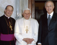 December 6, 2007. On behalf of the 1.7 million members of the Knights of Columbus, Supreme Knight Anderson presented His Holiness with a gift of $1.6 million, representing this year’s earnings from the Order’s Vicarius Christi Fund, which was established in 1981. Over the past 25 years, the fund has provided more than $43 million to the Vicar of Christ for his personal charities and causes. |