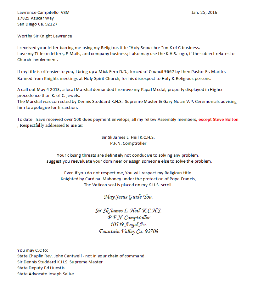 have made known , even though I have Knights Insurance, Steve Bolton " All of them are practicing unbecoming a member of the Knights of Columbus. I will be reaching out to the State office in the morning to get all of there contact information and stand ready to place formal charges on all of them and ask our State Deputy to Summary Suspend all of them until this matter is completed. Only with your approval. Please let me know how you would like me to move forward. " So All of them Quit |