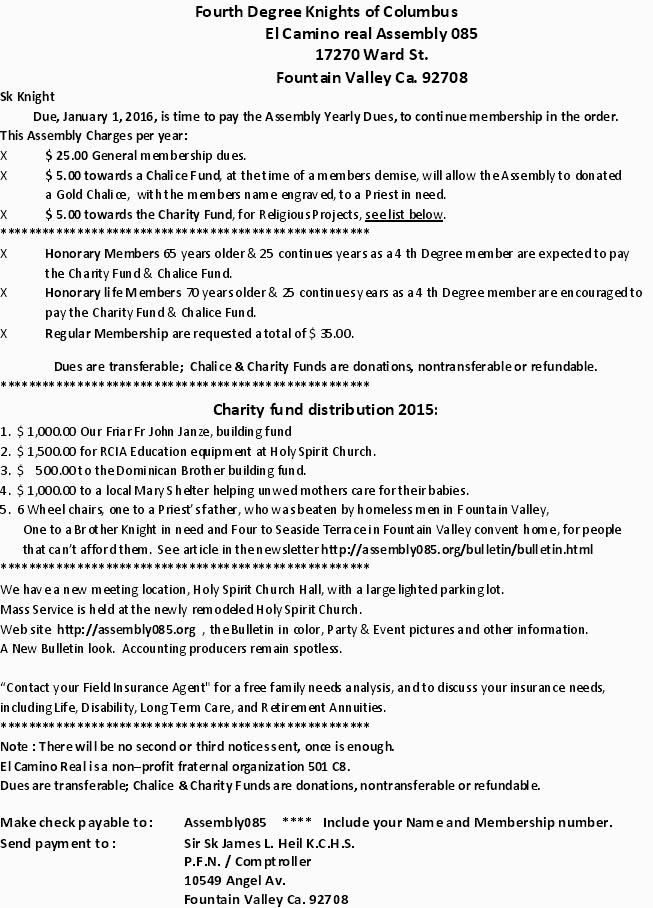 Al Castellano F.N. <alckofc@gmail.com , took to lunch & gave the priest the Past Navigators $ 500.00 donation check ( the check Al stopped payment, see below ), requesting a Memorial Mass for Assembly 85 & Priest be the Assembly Spiritual leader at Holy Spirit Church. NO CALL OUT for the mass. Al CASTELLANO F.N. DIDN'T SHOW UP. Apx. 10 Men did show, one never attends assembly meetings. As