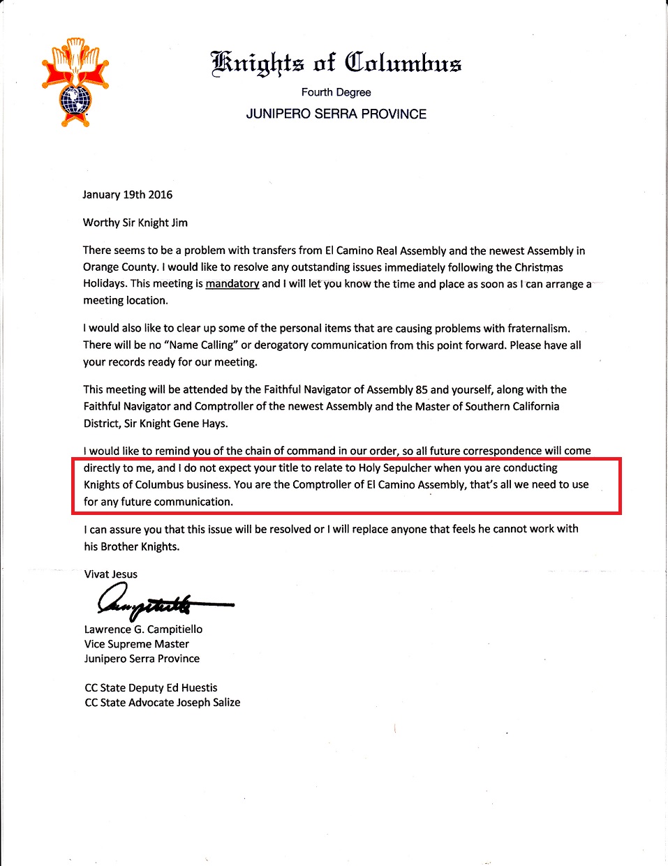 Unfortunately, after that ordination, the El Cameo boys got their feelings hurt and told their Marshall, which told a state deputy which wrote a letter to Bishop Cahill stating that the new uniform is the law now and to please accept it. THE LAW ?? now the K of C make laws for the church to follow |