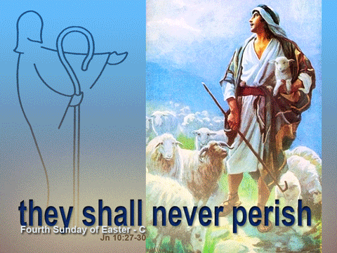 April 17 - Fourth Sunday of Easter - 1st reading Acts 13:14, 43-52; Psalm 100:1-3, 5; 2nd reading Revelation 7:9, 14-17; Gospel John 10:27-30 Jesus reaches out to all [Acts 13:47] Those who respond to His call [Ps 100:1-3] are His sheep [Jn 10:27-30] and will be brought to eternal life [Rev 9, 14-17] . |